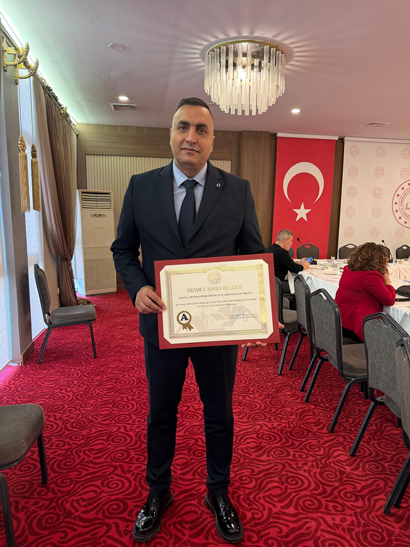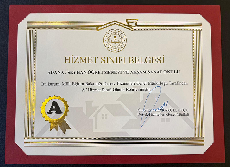 Adana Öğretmenevi, uyguladığı destek hizmetleri ve güvenlik standartlarını titizlikle yerine getirerek, ülkemizde yalnızca dört kuruma uygun görülen 'A Sınıfı Hizmet Belgesi'ni almaya hak kazandı. Belge, Destek Hizmetleri Daire Başkanı Abdullah Nehir tarafından Adana Öğretmenevi Müdürü Güven Güvener'e takdim edildi.
