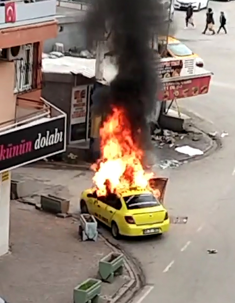 O anlar, bir vatandaşın cep telefonu kamerasına da yansırken, hastaneye kaldırılan Bülent U. ile eşi ve kızı da buradaki tedavilerinin ardından taburcu edildi. Polis, her yerde saldırganı ararken, önceki gün Bülent U.’nun oğlu Aras U.’ya ait ticari taksi, babasının işyerinin önündeyken kimliği henüz tespit edilemeyen bir kişi tarafından ateşe verildi. O anlar, yine saniye saniye cep telefonu kamerasına yansıdı. İtfaiye, yangını kısa sürede söndürürken, araç da demir yığınına döndü. Olayla ilgili soruşturma başlatılırken, kundakçı da aranıyor.