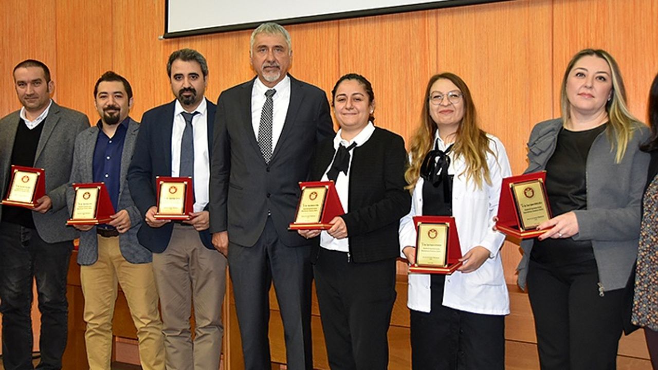 Özbarlas’ın konuşmasının ardından akredite olan 10 Ana Bilim Dalı’nın Başkanlarına teşekkür belgeleri verildi. Daha sonra akademik aşama kaydeden 10 Profesör, 7 Doçent, 8 Doktor Öğretim Üyesi’ne teşekkür plaketleri verildi.