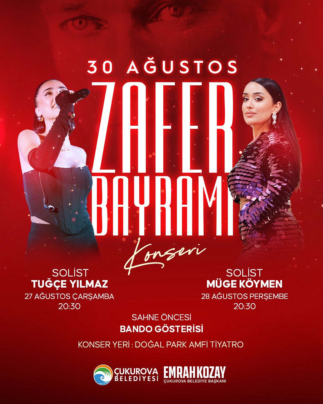 “Zaferin Şarkısı Çukurova’da Yankılanıyor” sloganıyla düzenlenecek etkinlikler, Doğal Park Amfi Tiyatro’da gerçekleştirilecek. Kutlamalar kapsamında; 27 Ağustos Çarşamba günü saat 20.30’da Tuğçe Yılmaz, 28 Ağustos Perşembe günü ise yine saat 20.30’da Müge Köymen sahne alacak. Konserlerin öncesinde yapılacak bando gösterisi, bayram coşkusunu doruk noktaya taşıyacak.