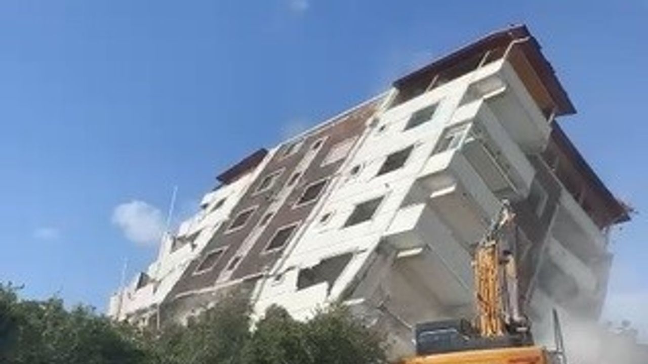 Kahramanmaraş merkezli depremlerde ağır hasar alan Hatay’da mahkeme süreci sona eren binaların yıkım ve enkaz kaldırma çalışmaları aralıksız sürüyor. Defne ilçesi Subaşı Mahallesi’nde bulunan 7 katlı bina, iş makinesinin darbesiyle yıkıldı. Binanın yıkılma anı ise kameralara anbean yansıdı. 7 katlı binanın yıkımı esnasında herhangi bir olumsuzluk yaşanmadı.