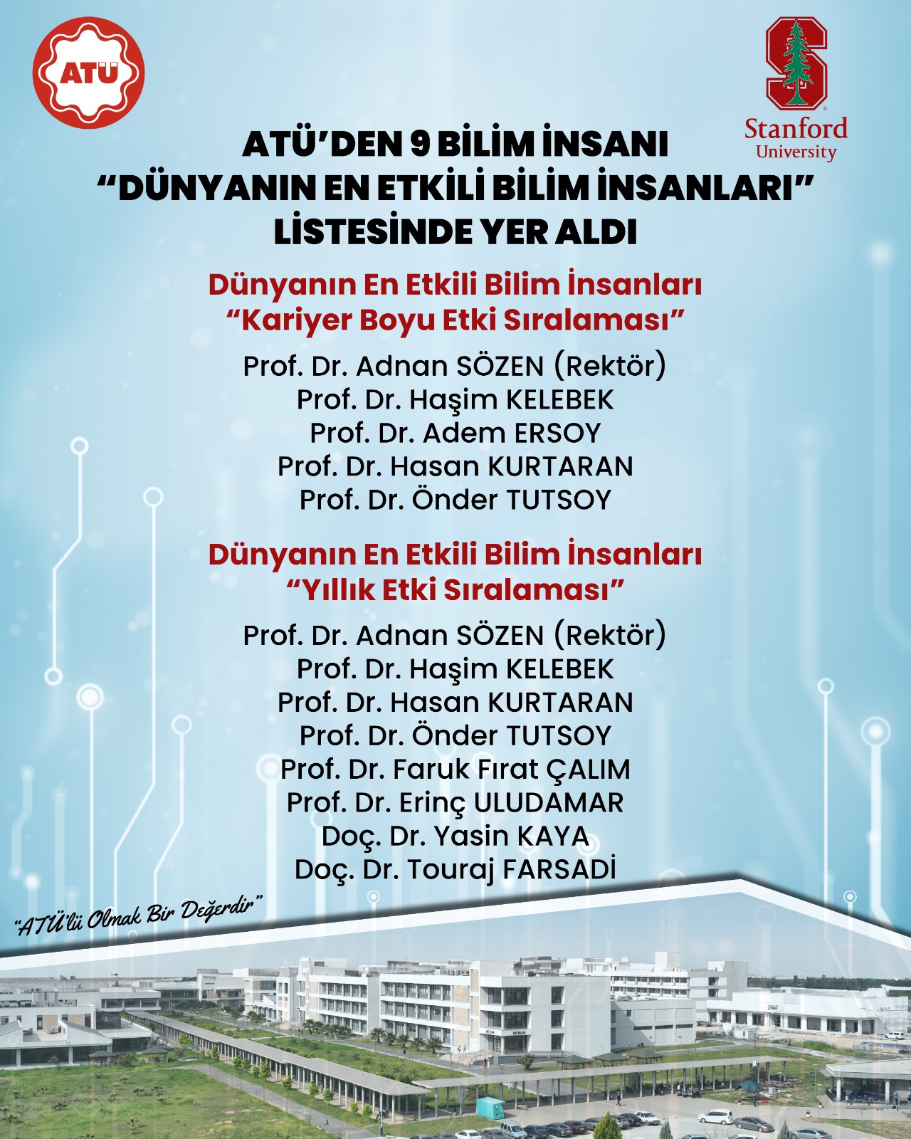 Stanford Üniversitesi ve Elsevier iş birliğiyle hazırlanan, bilim dünyasında saygın sıralamalardan biri olarak gösterilen bu listede ATÜ’den başta Rektör Prof. Dr. Adnan Sözen olmak üzere 9 akademisyen yer aldı.