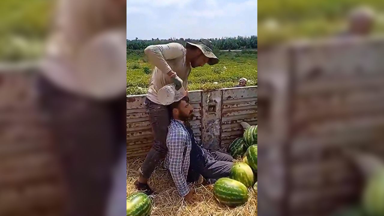 Karpuz tarlasındaki hasatta çalışan bir mevsimlik tarım işçisi de sıcaktan nasibini aldı. İşçi, toplanan karpuzları kamyonun kasasına yerleştirirken, sıcak ve güneşli hava nedeniyle fenalaşıp bayıldı. Bu kişiye de mesai arkadaşları müdahale edip, üzerine su dökerek onu serinleterek, kendine getirmeye çalıştı.