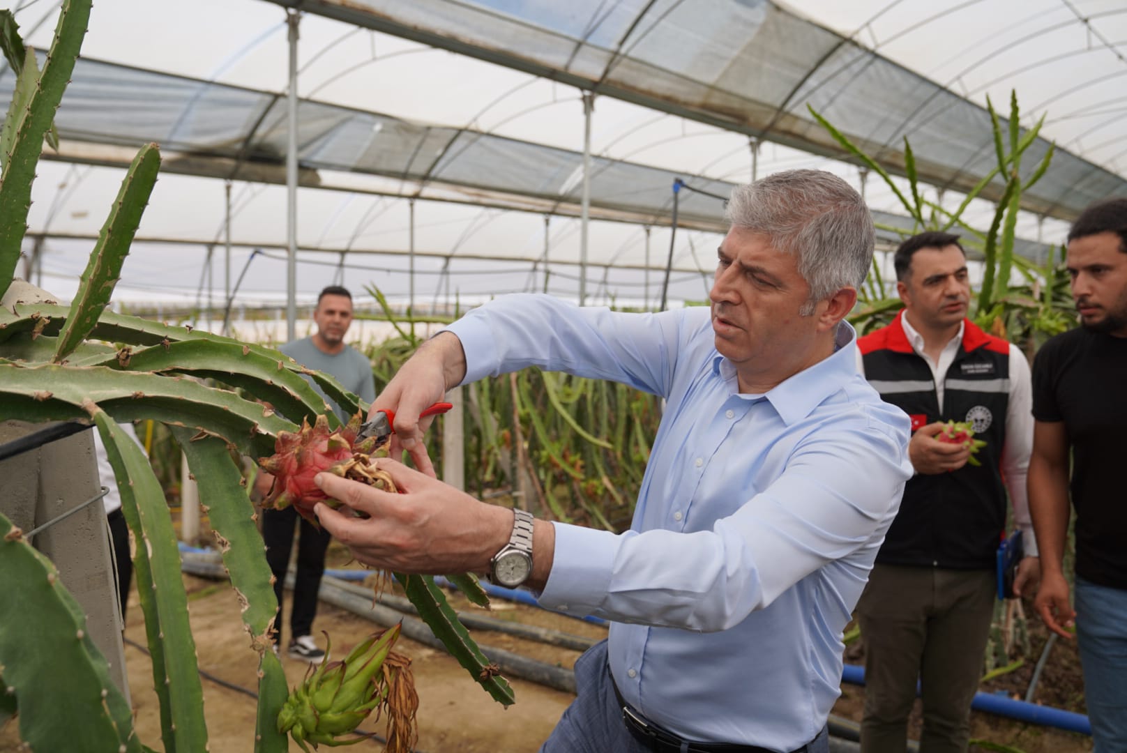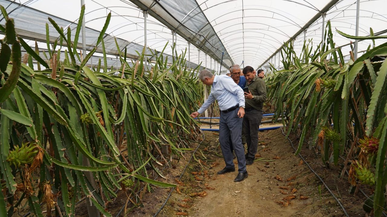 Ardından Bakanlık desteğiyle Ramazan Karalar tarafından kurulan mango ve ejder meyvesi seralarını ziyaret eden Bayazıt, üretim süreçlerini değerlendirirken ejder meyvesi hasadına da katıldı.