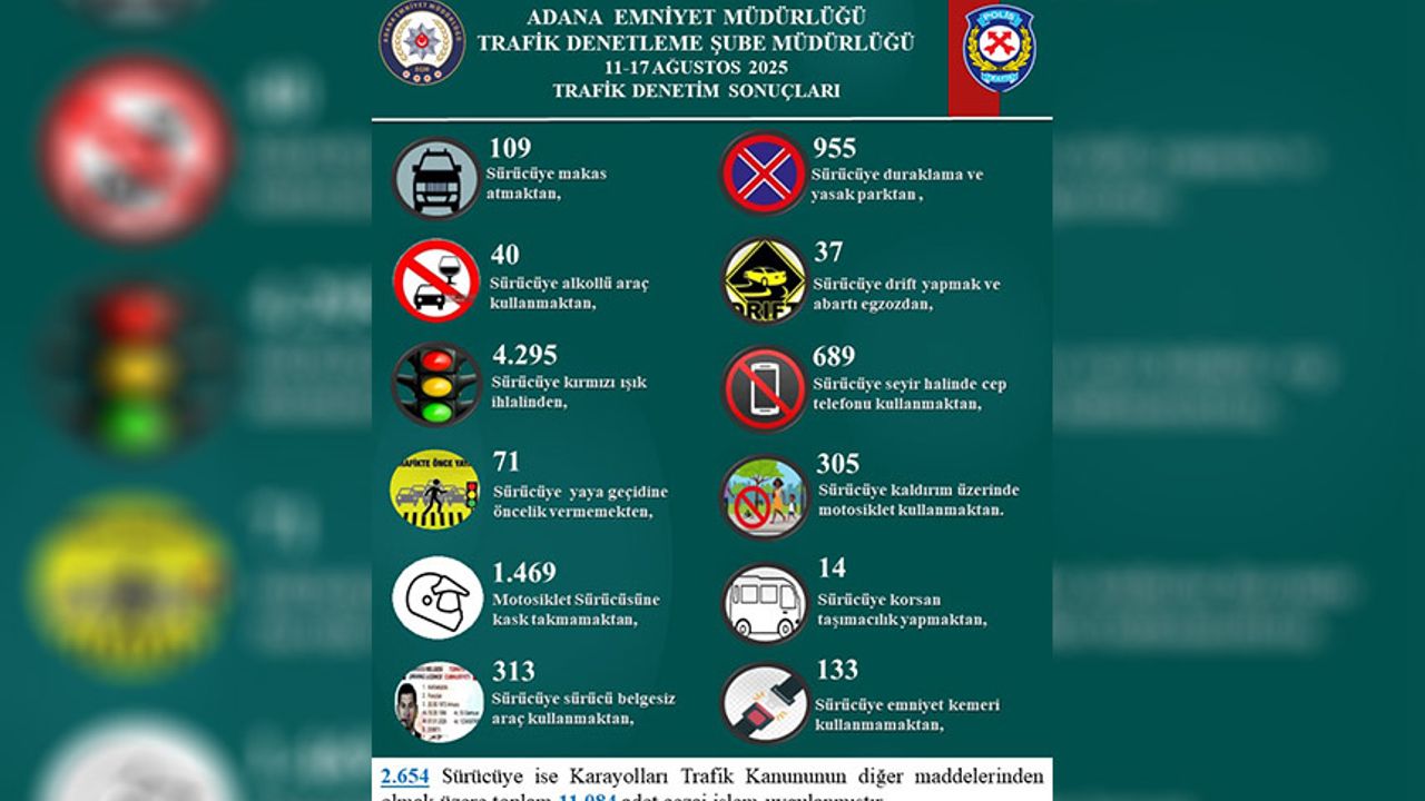 Denetimler sırasında çeşitli ihlaller nedeniyle toplam 2.654 sürücüye ceza uygulanırken, toplam cezai işlem sayısı 11.084’e ulaştı. Denetim sonuçlarına göre; 109 sürücü makas atarken, 4.295 sürücü kırmızı ışık ihlali yaptı. Yaya geçidinde yayaya öncelik tanımayan 71 sürücü ve kask takmayan 1.469 motosiklet sürücüsü cezalandırıldı. Ayrıca 313 sürücü sürücü belgesiz araç kullanırken, 955 sürücü duraklama ve yasak park ihlali nedeniyle ceza aldı.