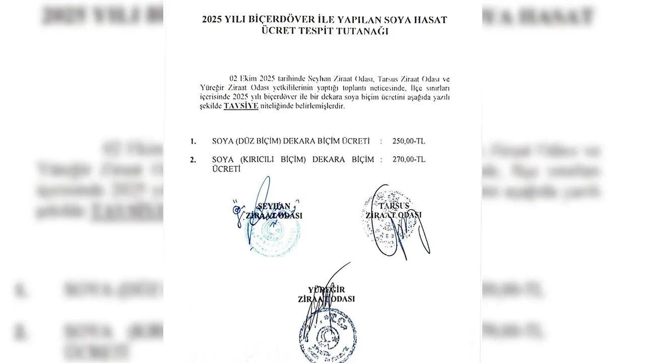 Toplantıda alınan karar doğrultusunda, ilçe sınırlarında uygulanacak 2025 yılı soya biçim ücretleri şu şekilde açıklandı: