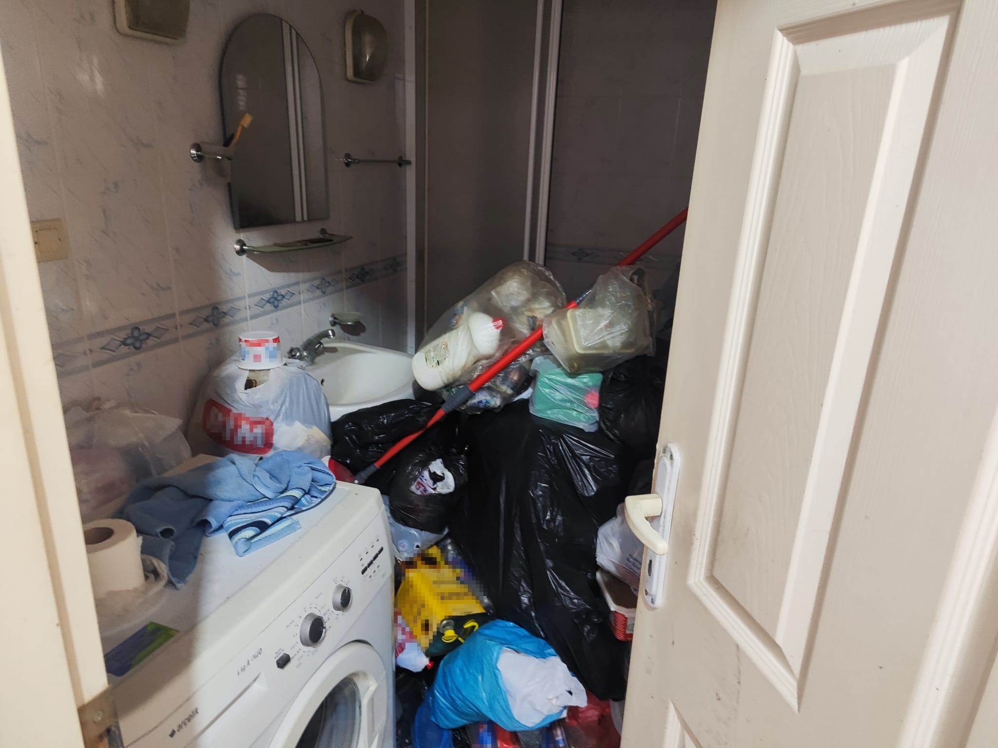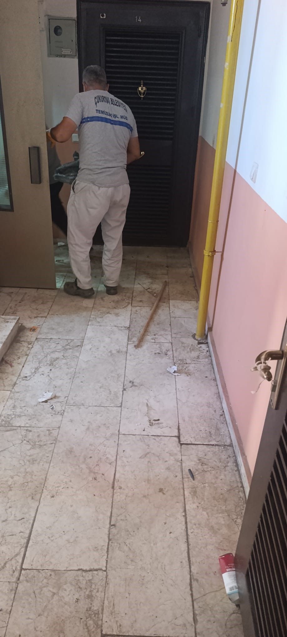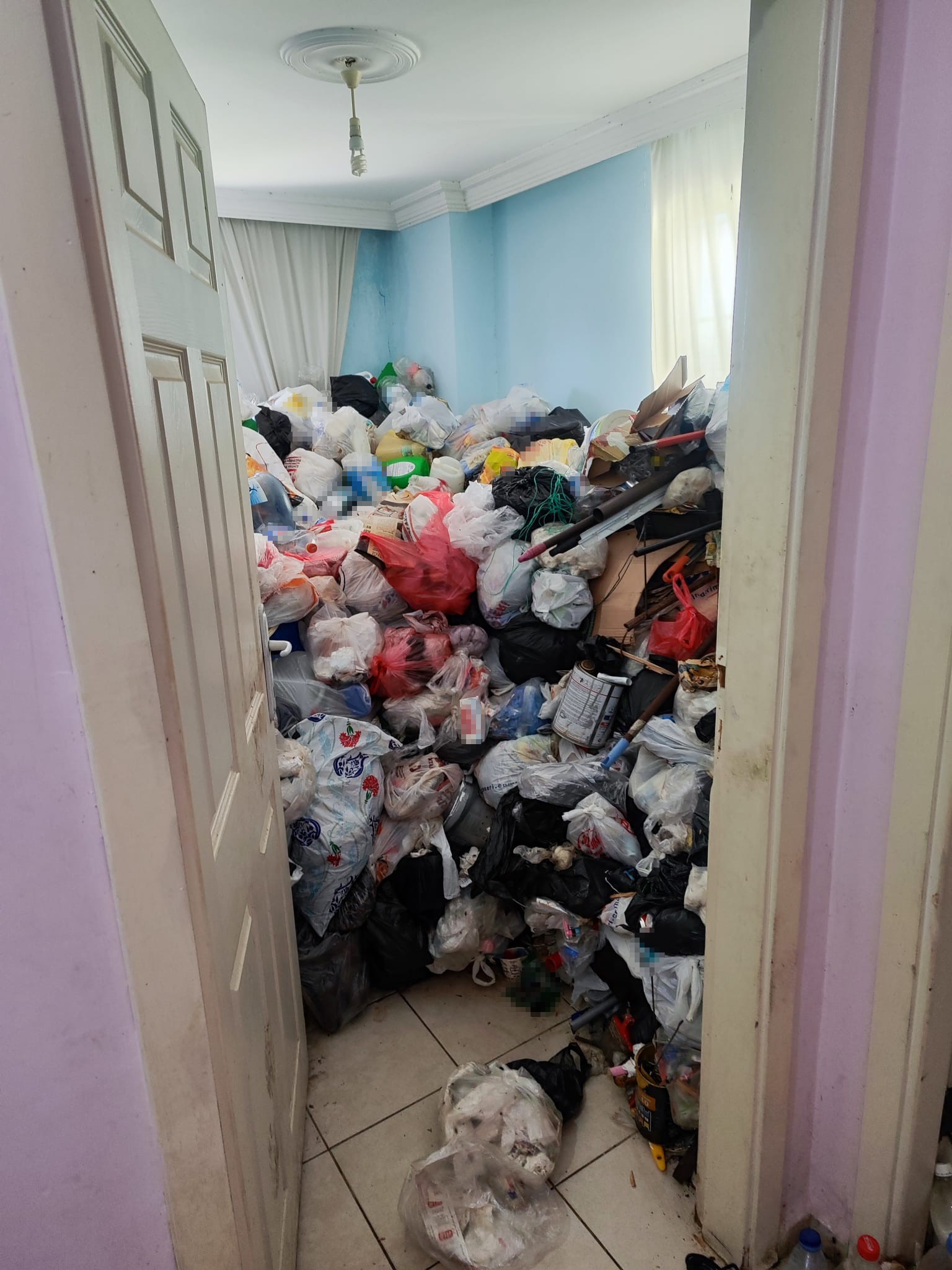 Dairede adeta çöp yığınlarıyla karşılaşan ekipler, belediye temizlik görevlilerinin desteğiyle evdeki atıkları çıkarmaya başladı.