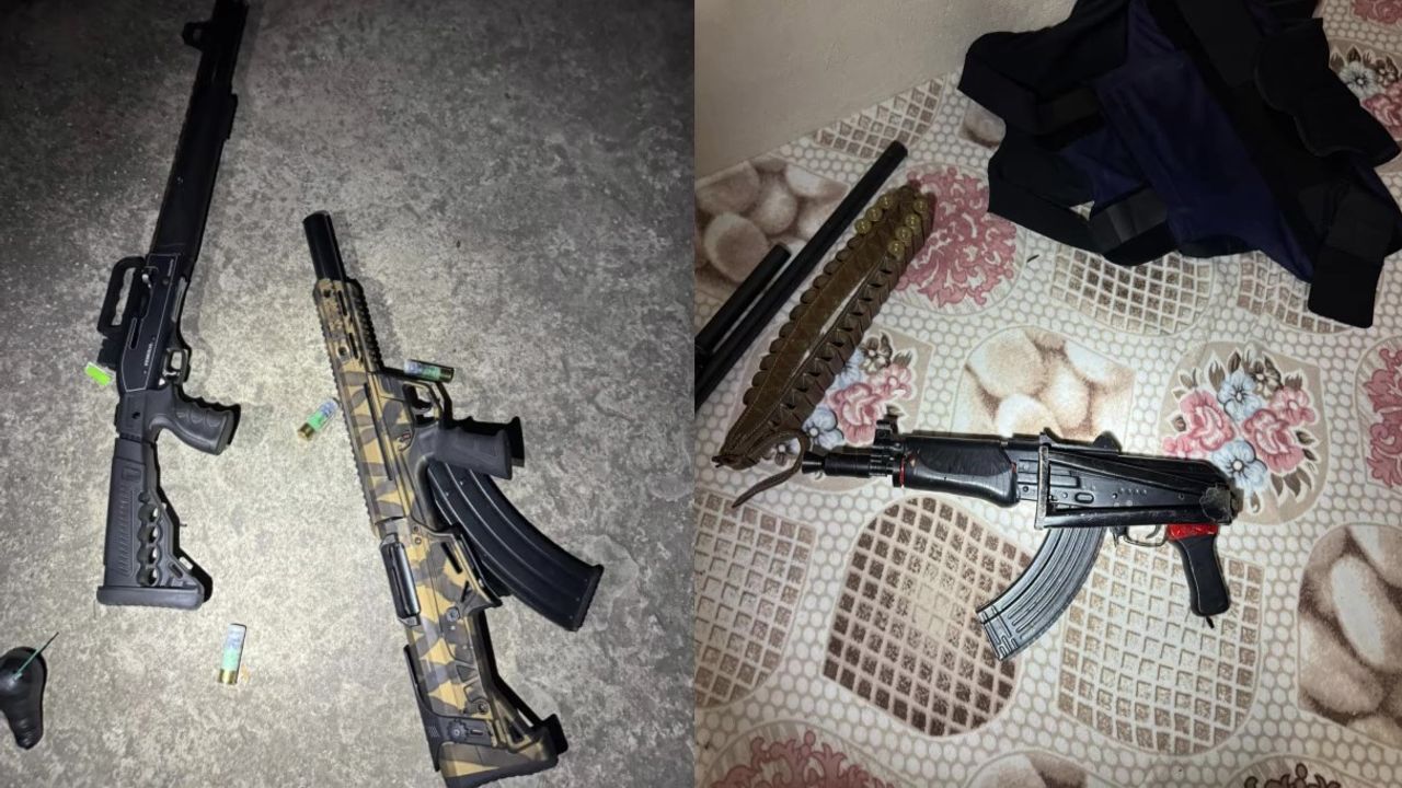 Adreslerde yapılan aramalarda, biri kalaşnikof, biri tabanca ve 4 tüfek olmak üzere toplam 6 silah, el yapımı patlayıcı, 375 mermi, çelik yelek, kar maskesi, pos cihazı, kredi kartları ve 2 bin 320 litre kaçak etil alkol ele geçirildi.