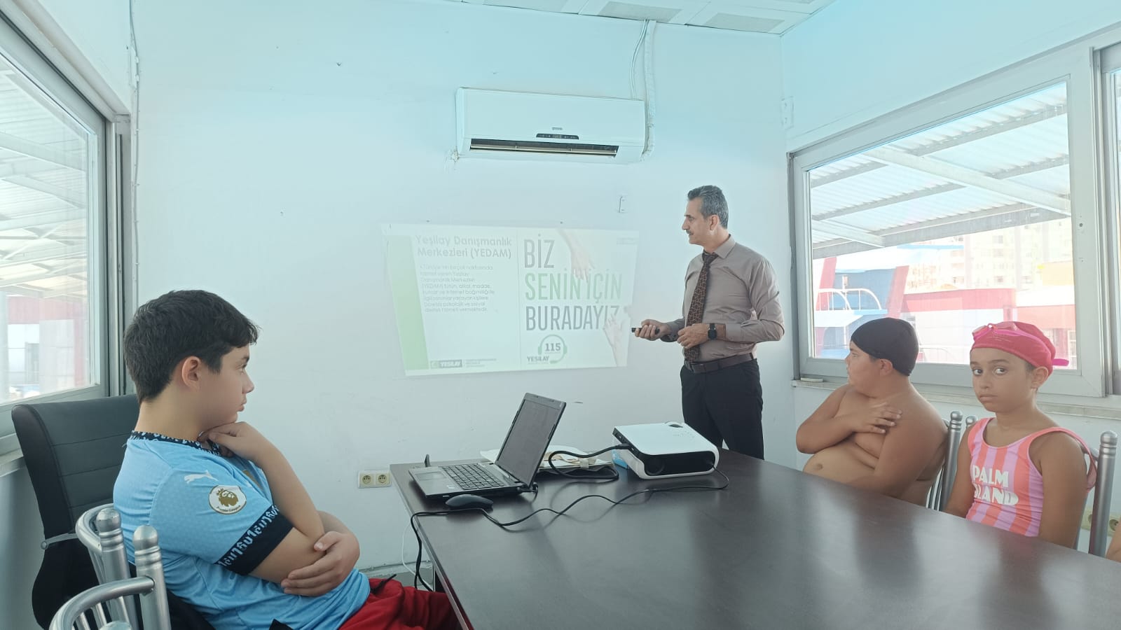 Bağımlılıkla mücadele faaliyetlerini sürdüren Yeşilay Adana Şubesi, “Yüzme Bilmeyen Kalmasın” projesi kapsamında Atatürk Yüzme Havuzu’nda eğitim alan sporculara teknoloji bağımlılığı konusunda bilinçlendirme çalışması gerçekleştirdi.