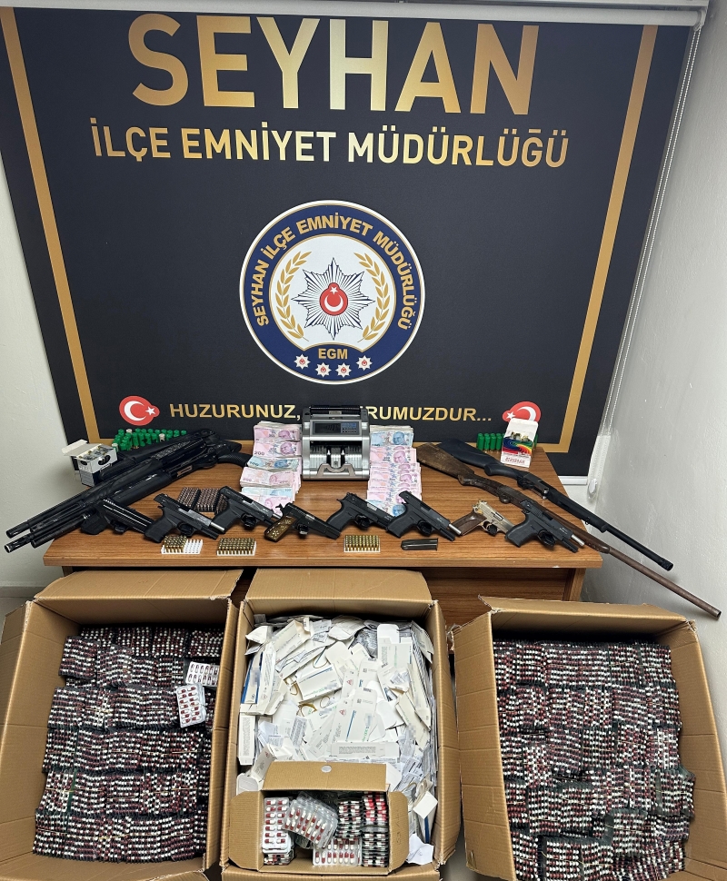 Yapılan baskınlarda 9 şüpheli gözaltına alındı. Serkan Ü.’nün iş yerinde yapılan aramada ise 1’i kurusıkı 8’i ruhsatsız tabanca, 4 ruhsatsız av tüfeği, 300 mermi, 54 bin 265 uyuşturucu hap, suçtan elde edildiği değerlendirilen 499 bin 150 lira ve para sayma makinesi bulundu. Silahların bir kısmının duvarın içindeki gizli bölmelere saklandığı belirlendi.