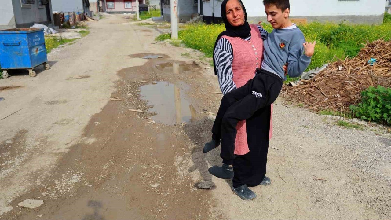 Eylem sırasında mahalle sakinlerinden Cemile Atay, zihinsel ve bedensel engelli oğlu Ahmet Atay’ı (17) kucağında getirerek yaşadığı zorlukları dile getirdi. Atay, “‘Okul servisi buraya girmiyor. Her gün çocuğumu yola kadar kucağımda taşıyorum, hastalıklara kaldım’” diyerek tepki gösterdi.