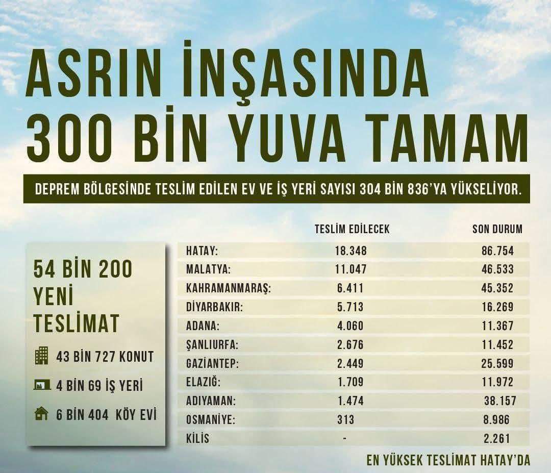 Açıklamaya göre, kentsel dönüşüm ve afet konutları kapsamında bugüne kadar 10 bin 978 konut ve 389 köy evi olmak üzere toplam 11 bin 367 bağımsız bölüm vatandaşların kullanımına sunuldu.