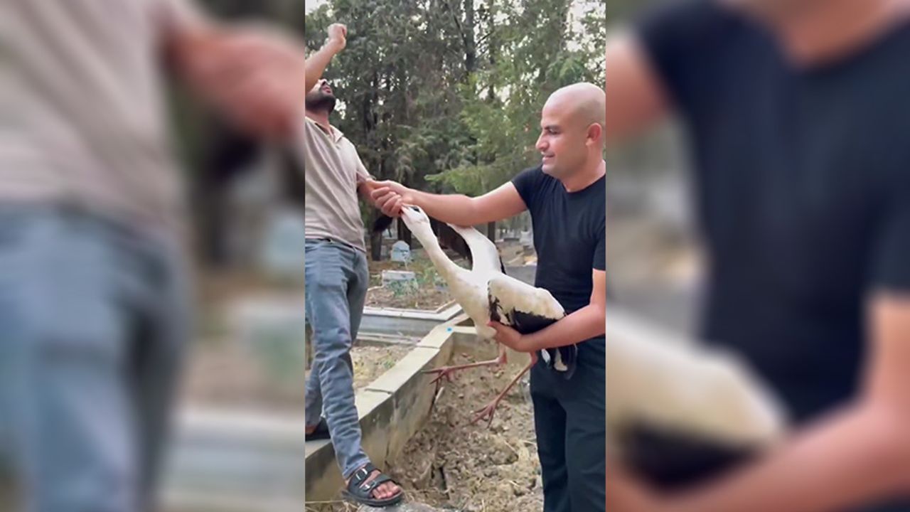 Durumu görünce hiç tereddüt etmeden harekete geçen vatandaş, leyleğin yardımına koştu. Hassas bir müdahaleyle ipten kurtarılan leylek, kısa süreli tedirginliğin ardından tekrar özgürlüğüne kavuştu. Kurtarıcısının ellerinden gökyüzüne süzülen leylek, arkadaşlarının peşinden göç yolculuğuna devam etti.