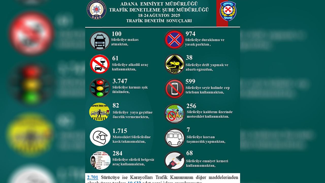 Hafta boyunca yapılan denetimlerde 3.747 sürücü, kırmızı ışık ihlali nedeniyle ceza aldı. Motosiklet sürücülerinin kask takmaması (1.715 kişi) ve duraklama/yasak park (974 kişi) en sık rastlanan diğer ihlaller arasında yer aldı.
