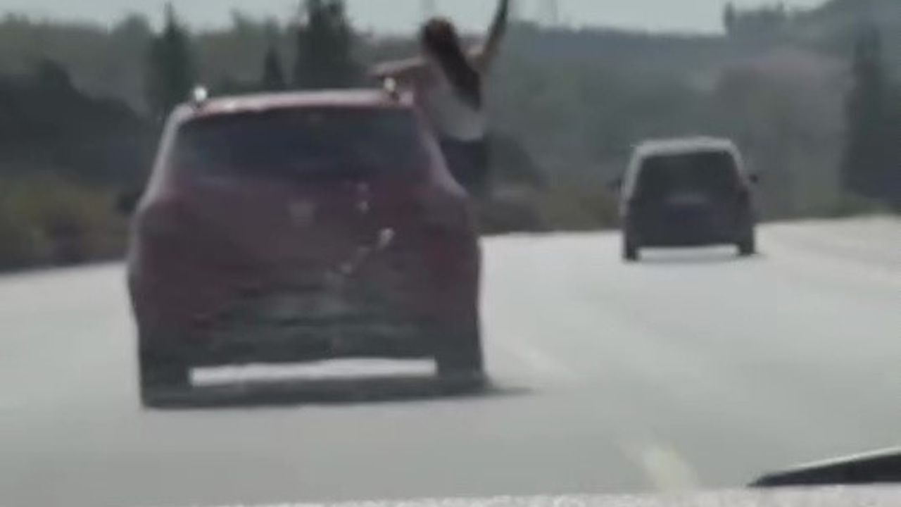 Olay, TAG Otoyolu üzerinde meydana geldi. Alınan bilgiye göre, hareket halindeki bir cipte yolcu olarak bulunan kadın, aniden camdan dışarı çıkarak aracın kapısına oturdu. Ellerini iki yana açarak bir süre bu şekilde yolculuk yapan kadının tehlikeli hareketleri, trafikteki diğer sürücüler tarafından kaydedildi.
