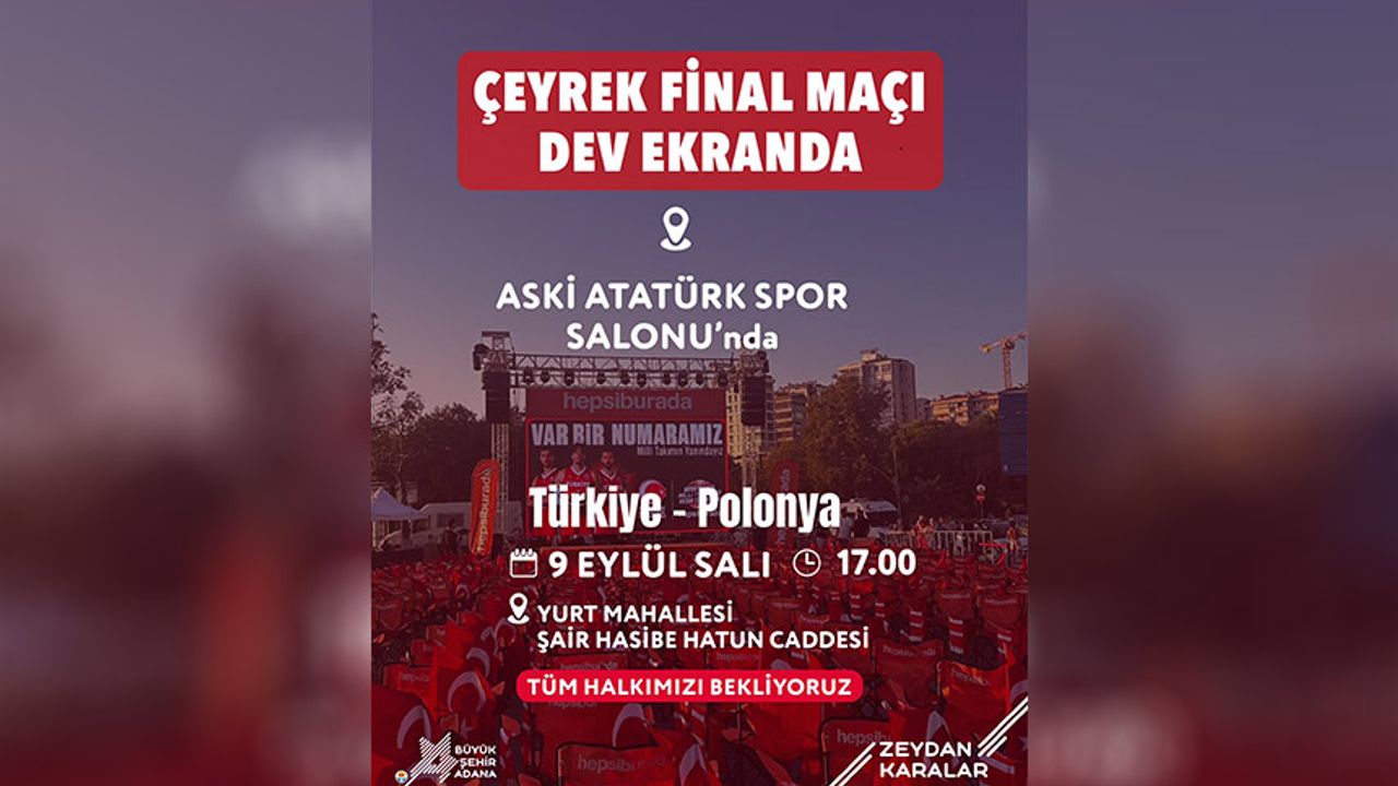ASKİ Atatürk Spor Salonu’na kurulan dev ekranla, Adanalılar milli takımın çeyrek final heyecanını ücretsiz olarak yaşayabilecek. Türkiye - Polonya maçı saat 17.00’de başlayacak.