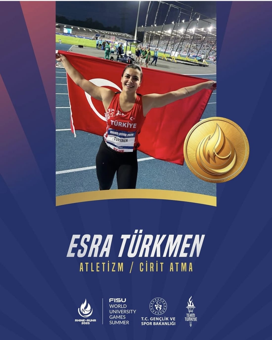 “Adana TOHM Sporcumuz Esra Türkmen’den altın madalya. FISU 2025 Dünya Üniversite Yaz Oyunları’nda ülkemizi atletizm cirit atmada temsil eden Esra Türkmen, 59.90m’lik atışıyla altın madalya kazandı. Sporcumuz Esra Türkmen'i ve Sporcumuzun TOHM Antrenörü Ahmet Dalak Hocamızı tebrik ediyoruz.”