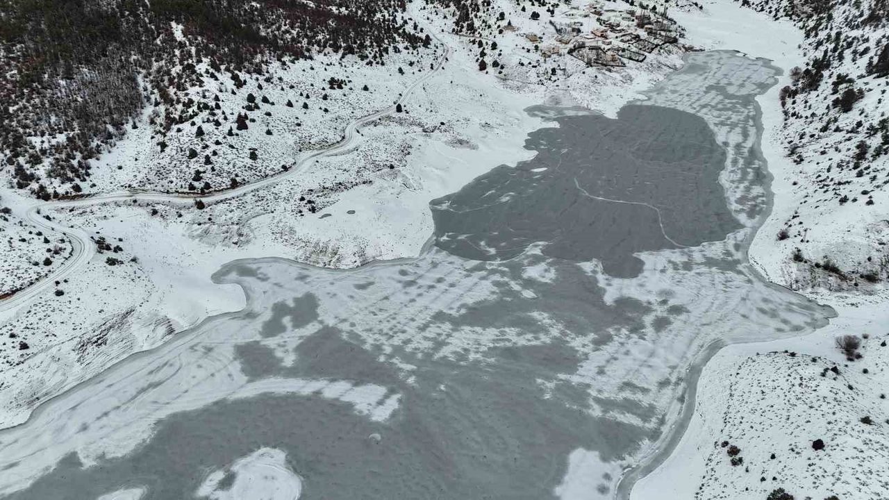 Hava sıcaklığının eksi 25 dereceye kadar gerilediği Tufanbeyli’de Kürebeli Barajı’nın yüzeyi kalın bir buz tabakasıyla kaplandı. Barajın buz tutmasıyla birlikte ortaya çıkan görüntüler dikkat çekerken, göl yüzeyi adeta doğal bir buz pistine dönüştü. Buzla kaplanan baraj, dron ile de görüntülendi.