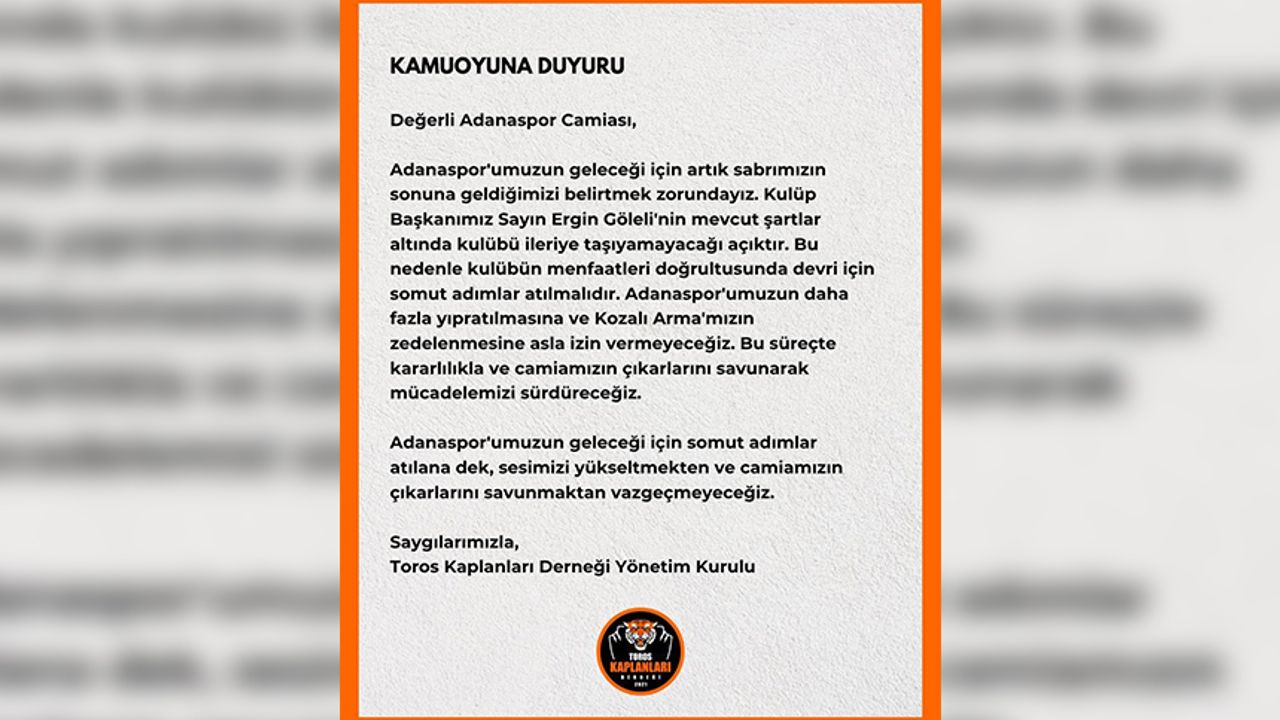 Adanaspor’un geleceği için atılacak adımların takipçisi olacaklarını belirten Toros Kaplanları, seslerini yükseltmeye ve mücadelelerini sürdürmeye kararlı olduklarını da kamuoyuna duyurdu.