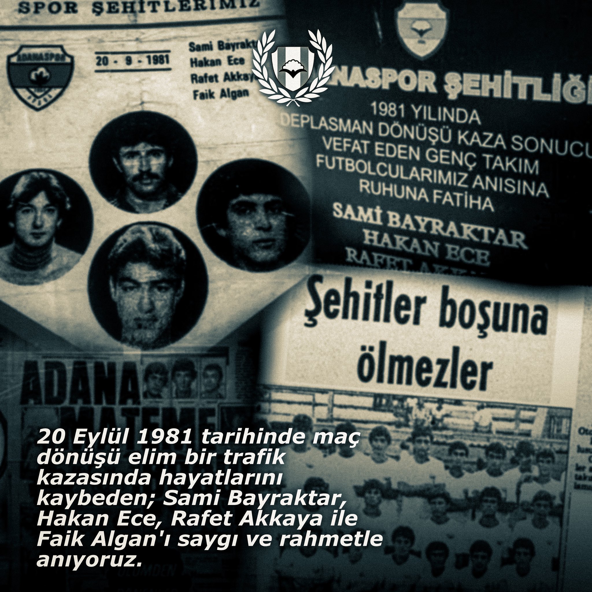 Turbeyler Grubu, sosyal medya hesabından yaptığı paylaşımda, “20 Eylül 1981 tarihinde maç dönüşü elim bir trafik kazasında hayatını kaybeden Adanaspor şehitleri; Genç Takım Antrenörü Sami Bayraktar ve futbolcu büyüklerimiz Hakan Ece, Rafet Akkaya ve Faik Algan'ı rahmetle yad ederiz.” ifadelerine yer verdi.