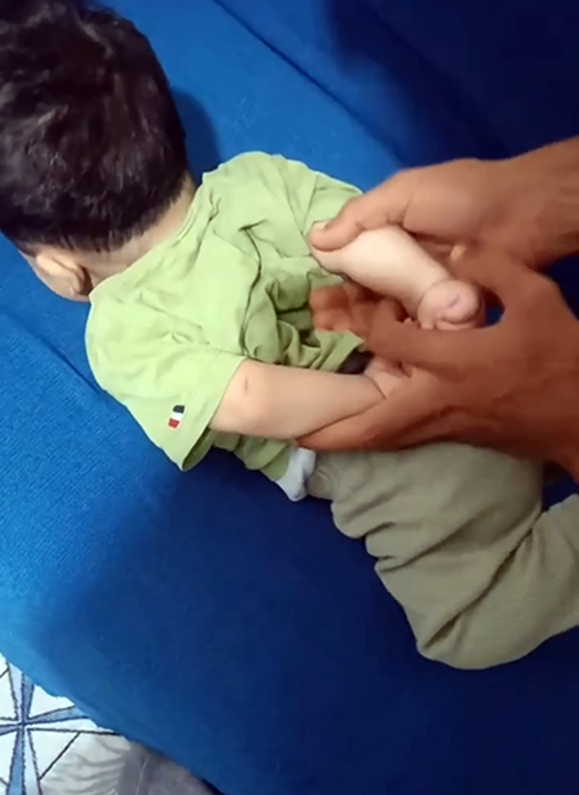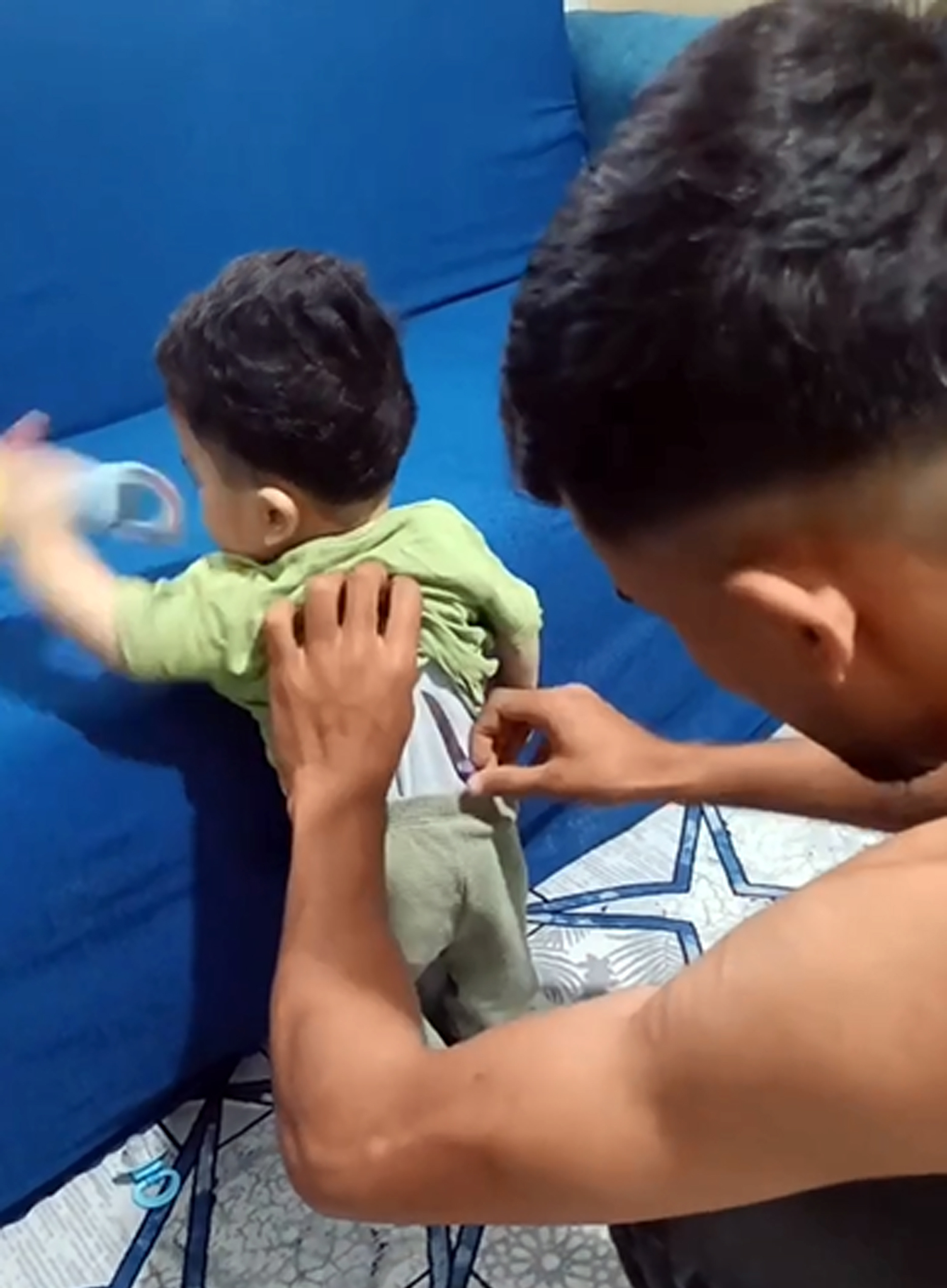Oğlunu yüzü kanepeye gelecek suçlu gibi ayakta tutan baba, daha sonra onu yüzükoyun kanepeye yatırıp, kollarını ters kıvırarak sözde gözaltı işlemi uyguladı.