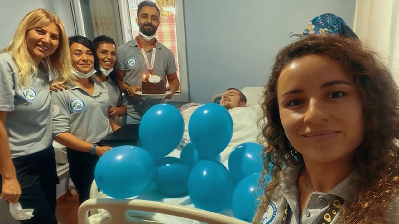 Ellerinde pastayla gencin odasına girip, ona sürpriz bir doğum günü kutlaması yapan sağlık