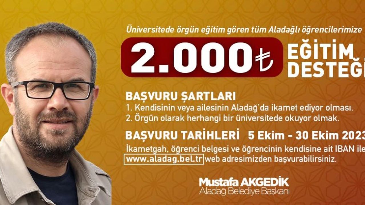 Düşüncelerini sosyal medyadan paylaşan Başkan Akgedik, “Sevgili gençler, bu yıl da Aladağlı tüm örgün okuyan üniversite öğrencilerimize eğitim yardımı yapacağız. Başvurular 5 Ekim’de başlıyor.” dedi.