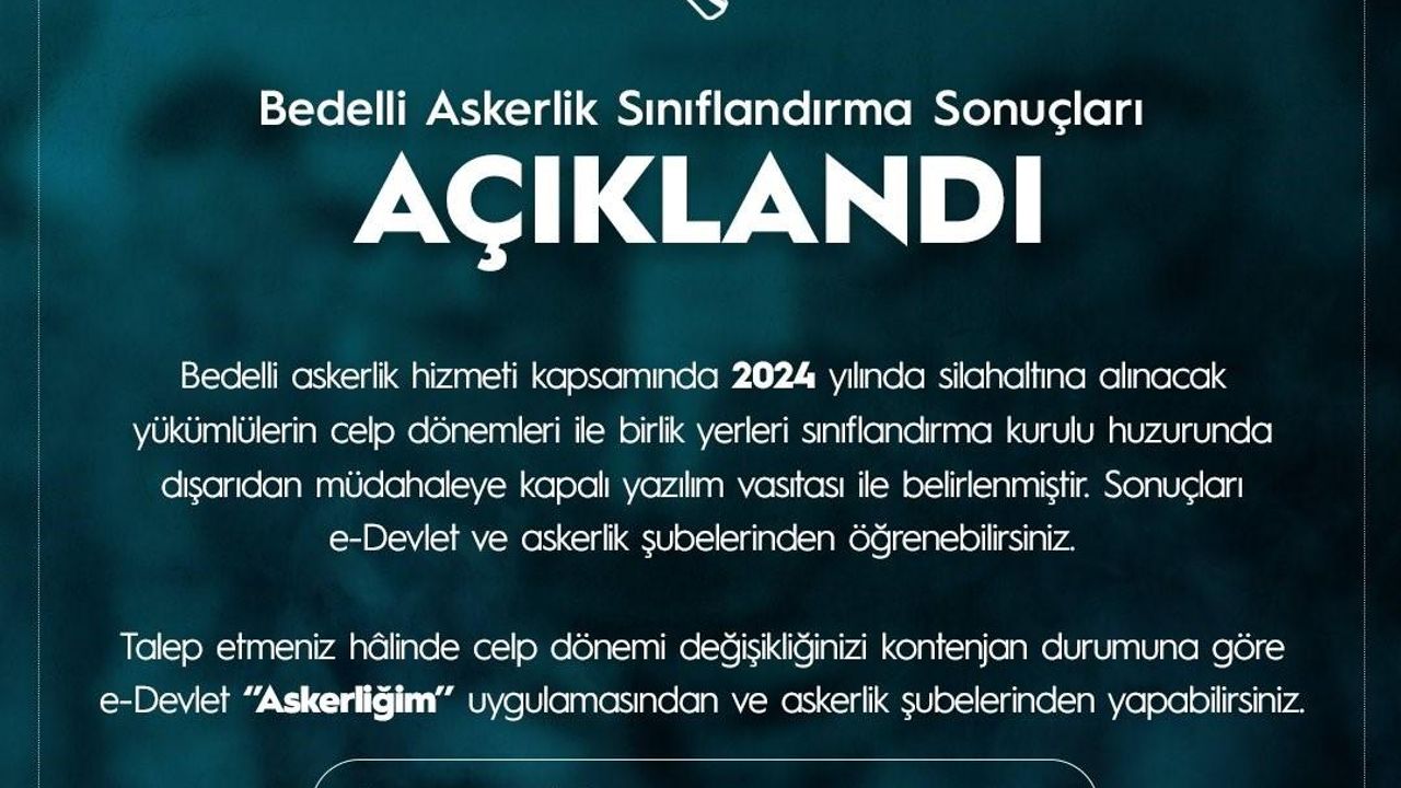 MSB’den yapılan yazılı açıklamaya göre, bedelli askerlik hizmeti kapsamında 2024 yılında silah altına alınacak yükümlülerin celp dönemleri ile birlik yerleri sınıflandırma kurulu tarafından belirlendi. Sonuçlar, e-Devlet ve askerlik şubelerinden öğrenilebilecek.