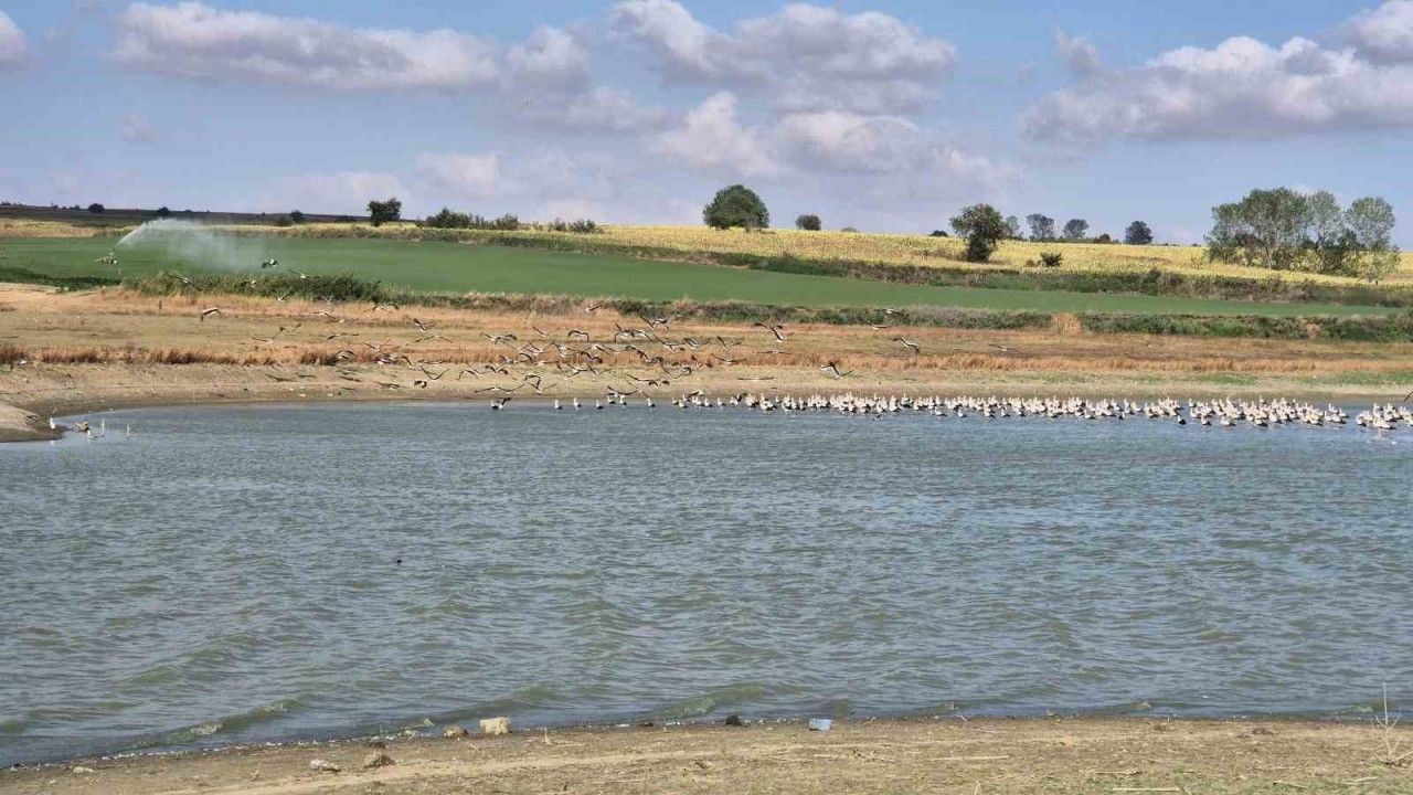 Yaz aylarının sıcak günlerinde serin su kenarında toplanan leylekler, sabah erken saatlerden itibaren sürüler halinde gölete iniş yaparak hem dinlendi hem de beslendi.