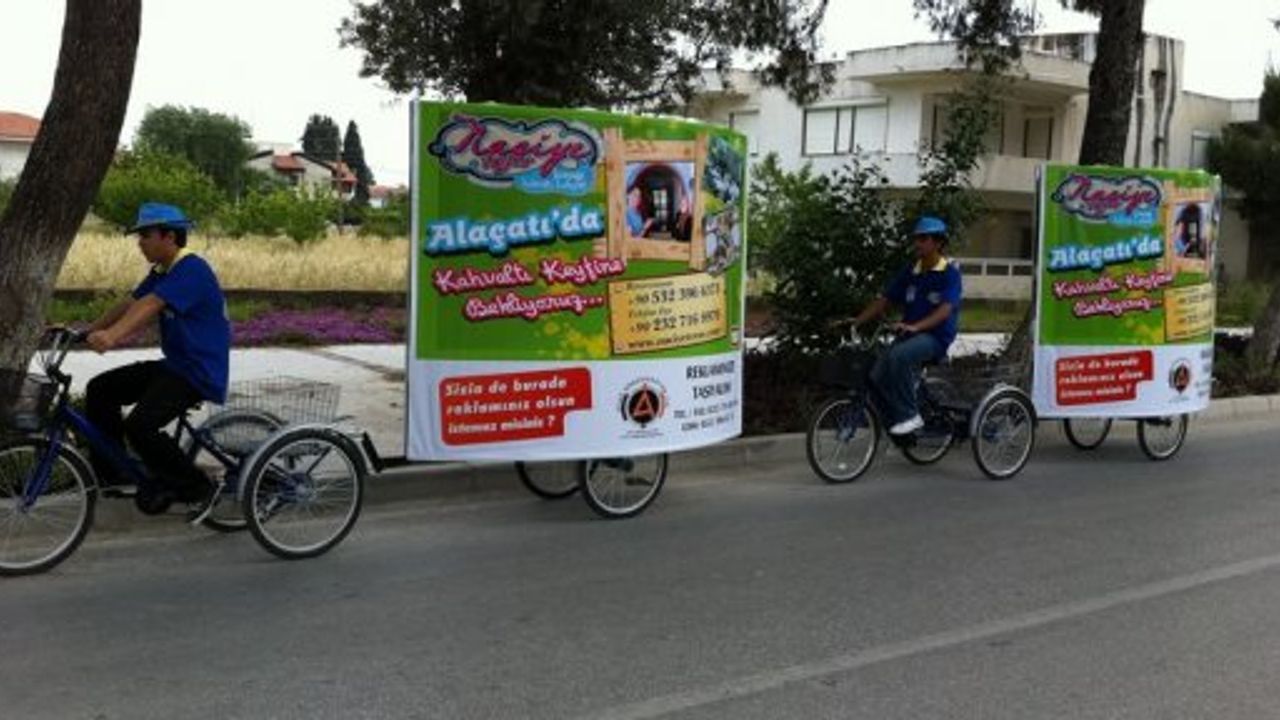 MNT Reklam Bisikleti projesindeki ekip markalar için caddelerde, sokaklarda ya da sizin seçtiğiniz herhangi bir yerde pedal çeviriyor. Böylece reklam işini ilan panosu, televizyon gibi alışılmış alanlardan çıkarıp hayatın içine sokuyor. Yani onların bisikletleri, markaların istekleri doğrultusunda tasarlanan, dolaşan panolara dönüşüyor. Mehmet TURAÇCI Ve Cengizhan DURMUŞ'un projesinin en önemli taraflarından biri de çevreye duyarlı olması. Çünkü hem bisiklet insan gücüyle çalıştığı için çevreye zarar vermiyor hem de Afişler için kullandıkları kağıtları da geri dönüşümlü malzemelerden yaptırıyorlar. Proje henüz çok yeni ama saatte ortalama 10-15 km. hızla giden bu reklamlar insanların dikkatini çekmeye başlamış bile. Şimdilik sadece Adana’da dolaşan MNT Reklam Bisikletiri için ikinci hedef ise Mersindir. www.mntmedya.com