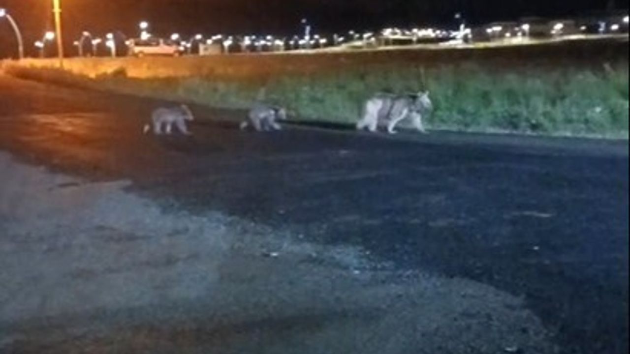 Kars’ın Sarıkamış ilçesinde gece vakti, iki minik yavrusuyla birlikte caddeye çıkan boz ayı, o sırada aynı caddeden geçen bir vatandaş tarafından görüntülendi. Anne ayının kendinden emin ve sakin tavırları dikkat çekti.