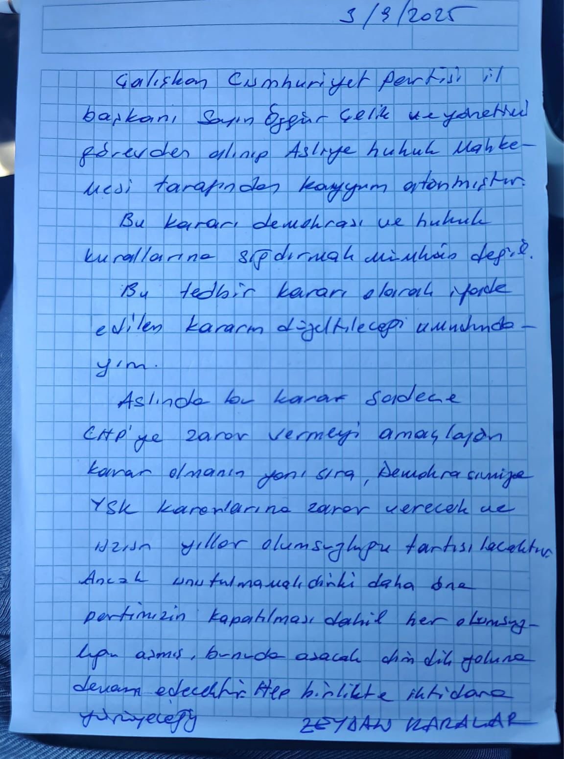 Cumhuriyet Halk Partisi (CHP) İstanbul İl Başkanı Özgür Çelik ve yönetim kuruluna Asliye Hukuk Mahkemesi tarafından kayyum atanması kararı, siyasi arenada tartışmalara yol açtı. Karara ilişkin görüşlerini paylaşan Karalar, alınan tedbir kararının demokrasi ve hukuk kurallarıyla bağdaşmadığını belirtti: “Bu kararı demokrasi ve hukuk kurallarına sığdırmak mümkün değil. Bu tedbir kararının düzeltileceği umudundayım.”