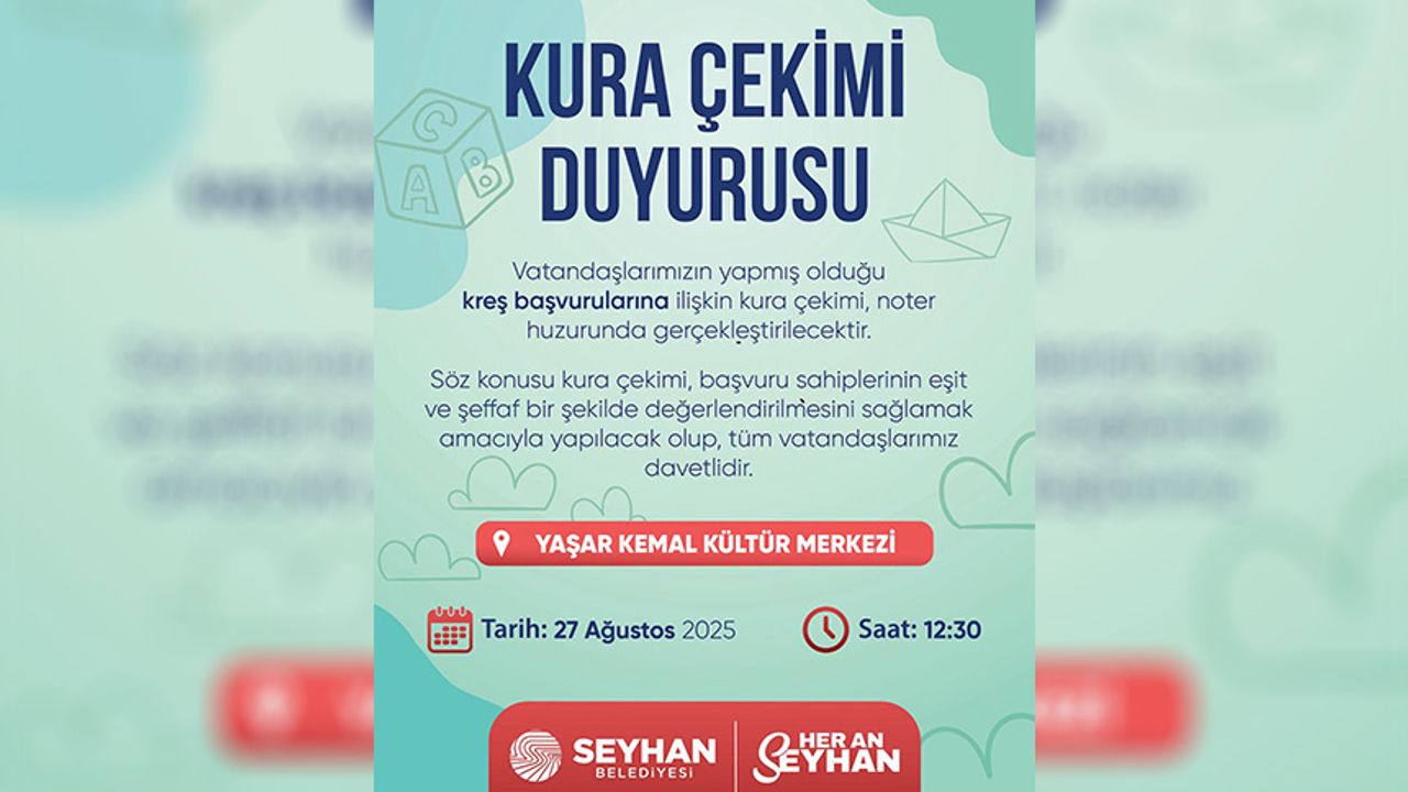 Kura çekimi, 27 Ağustos 2025 Çarşamba günü saat 12.30’da, Yaşar Kemal Kültür Merkezi'nde düzenlenecek. Seyhan Belediyesi, tüm vatandaşları bu önemli ve şeffaf sürece katılmaya davet etti.