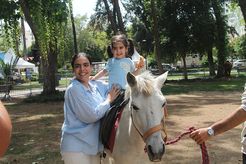 Kurulan özel alanda ata binen çocuklar heyecanlı ve keyifli anlar yaşadı. Stantta görev alan Süvari Binicilik Antrenörü Murat Uğur, “Burada çocuk festivali var. Bizi de davet ettiler. Onları kırmadık ve geldik. İnsanlara hem at biniciliğini sevdiriyoruz hem de atları tanıtıyoruz. İleriye dönük inşallah buradan bir sporcu çıkarırız.” dedi.