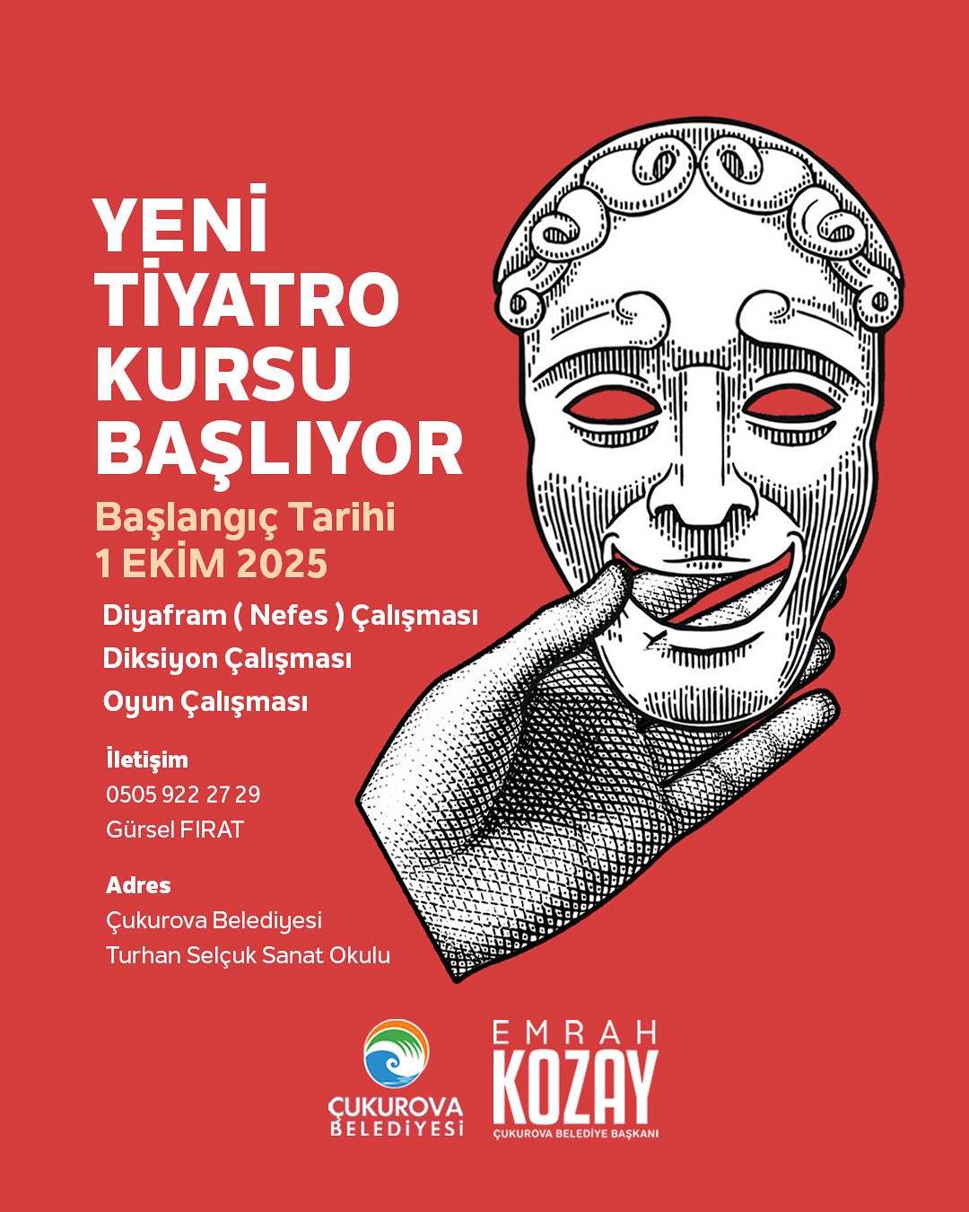 Çukurova Belediye Başkanı Emrah Kozay, tiyatroya ilgi duyan herkesi kursa katılmaya davet ederek, “Sahne ışıkları sizleri bekliyor. Gelin, sahnede birlikte büyüyelim” dedi.
