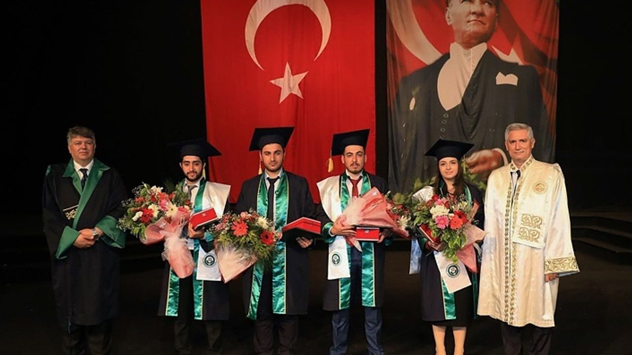 Açılış konuşmalarının ardından fakülte birincisi Mouheeb Aous yaş kütüğüne plaketini çakarken dereceye giren öğrencilere Rektör Prof. Dr. Mustafa Kibar diplomalarını takdim etti. Diplomalarını alan öğrenciler keplerini fırlatarak mezun oldu.