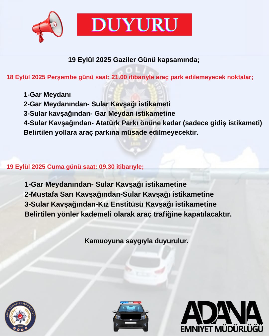 Emniyet yetkilileri, belirtilen güzergâhlara park eden araçlara cezai işlem uygulanacağını bildirdi.