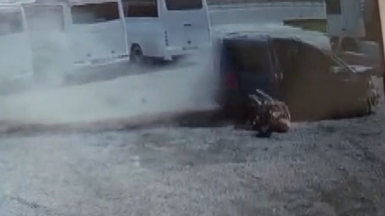 Kontrolden çıkan hafif ticari aracın yol kenarındaki galeriye dalarak park halinde yakıt tankerine çarpıp durma anları ise çevredeki bir güvenlik kamerasına yansıdı. Görüntülerde, çarpma anı öncesi hafif ticari araçta bulunan bir kadının kendini dışarı atma ve aracın altında kalmaktan son anda kurtulma anları ise yürekleri ağza getirdi.