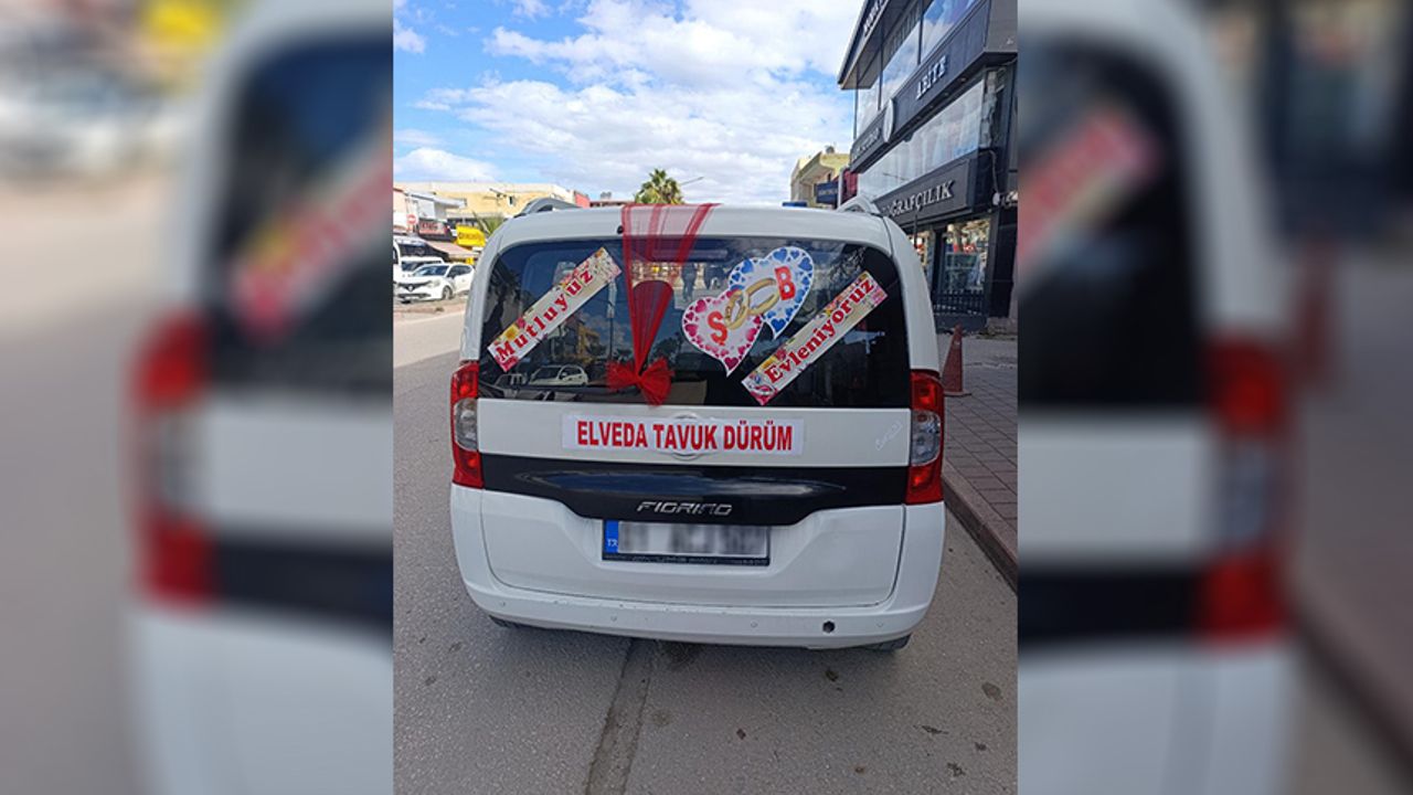 gelin arabasının arkasına; “Elveda tavuk dürüm” ifadesi yer alan döviz astı; ortaya da ilginç
