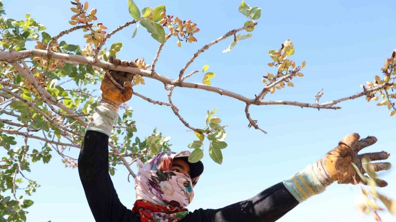 Yüksek sıcaklıklara rağmen fıstık tarlalarında hummalı bir şekilde süren hasat, mevsimlik işçilerin çabasıyla devam ediyor.