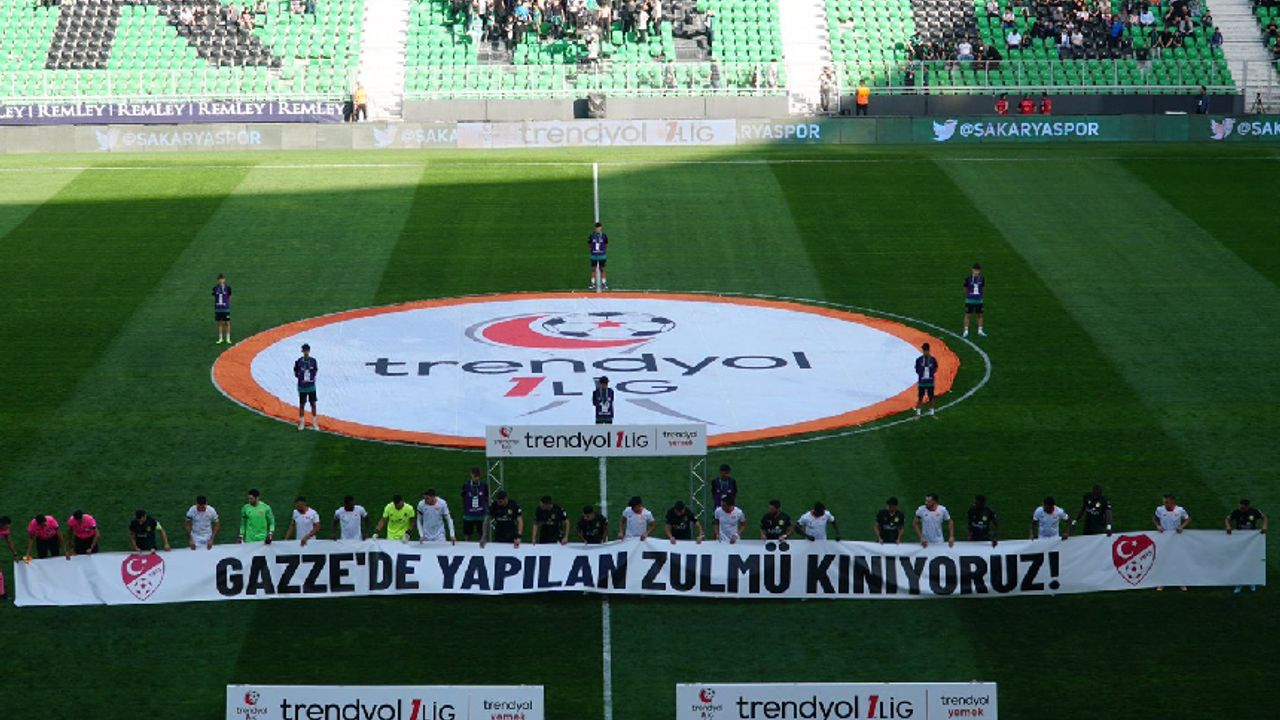 Her iki takım oyuncuları da sahaya üzerinde; ‘Gazze’de yapılan zulmü kınıyoruz’ ifadesi yer alan pankartla çıktı.. Tribünlerdeki taraftarlar da İsrail aleyhine sloganlar attı..