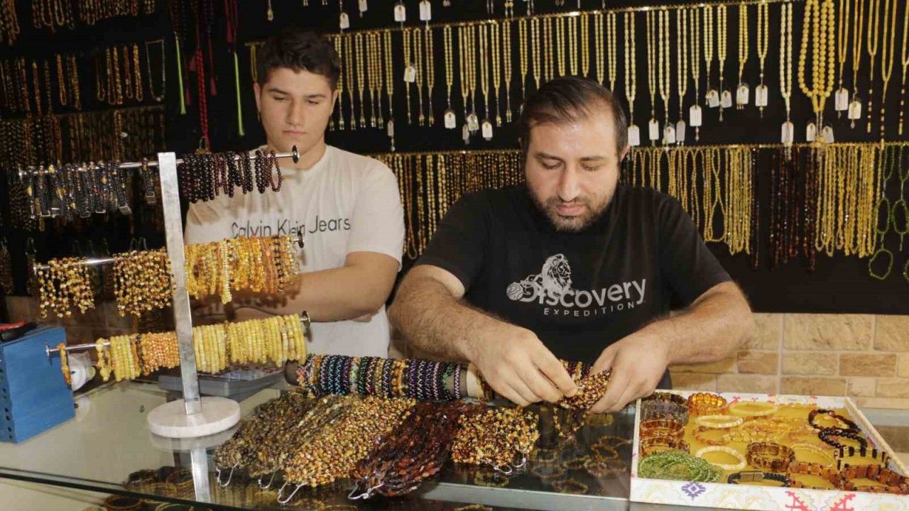 “Tüketiciler bunun orijinalini bilemezler. Orijinal damla kehribar taşları, içinde belirli bir miktar tuz bulunan suyun üzerine çıkar. Orijinali üstte durur, alta inen damla kehribar sahtedir. Tabii o tuz dengesini, oranını da iyi yakalamak lazım. İşçilikli ürünlerimiz de var, standart ürünlerimiz de var. İşçilikli ürünlerimiz biraz daha maliyetli olduğu için fiyatlar biraz daha yüksek ama ortalama kolyelerimiz 700 liradan başlıyor. Bileklikler ortalama 200-250 liradan başlıyor. Tabii bu fiyatlar 3 bin liraya kadar çıkabiliyor, o da işçilikten kaynaklanıyor. Tespihlerimiz 350 liradan başlıyor, 40-50 bin liraya kadar da yükseliyor.”