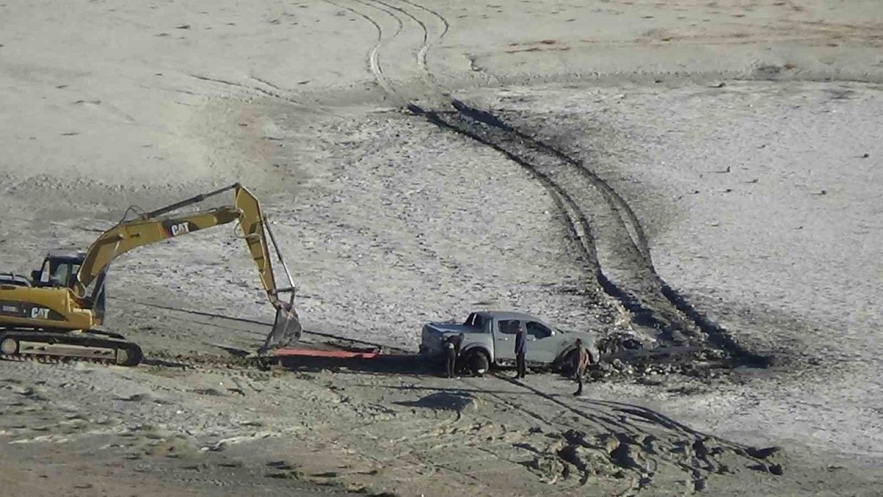 Edinilen bilgilere göre, Fransa’dan gelen gurbetçi bir aile, pikap tipi araçlarıyla kuruyan göl tabanına indi. Ancak araç bir süre sonra zeminin yumuşak kısmına saplanarak hareket edemez hale geldi. Göl tabanına araçla girmenin yasak olduğunu bilmediklerini söyleyen aile, ilk etapta çevredeki vatandaşlardan yardım istedi.