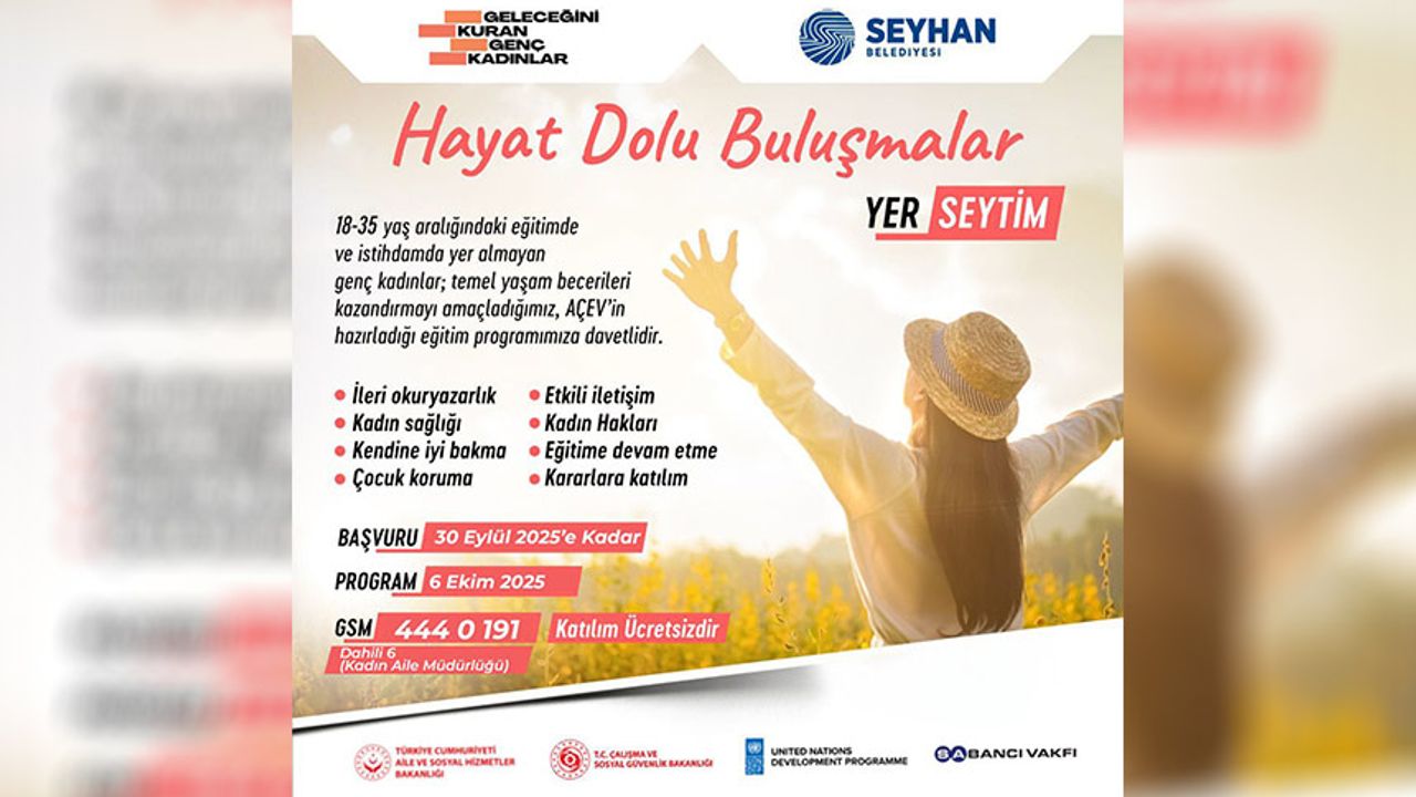 Eğitimler, Seyhan Belediyesi Toplum Merkezi (SEYTİM) bünyesinde gerçekleştirilecek. Programa başvurular 30 Eylül 2025 tarihine kadar kabul edilecek olup, eğitimler 6 Ekim 2025 tarihinde başlayacak. Katılım tamamen ücretsiz olacak. Ayrıntılı bilgi almak isteyenler 444 0 191 (Dahili 6 – Kadın Aile Müdürlüğü) numaralı telefondan başvuru ve detaylar hakkında bilgi alabilecek.
