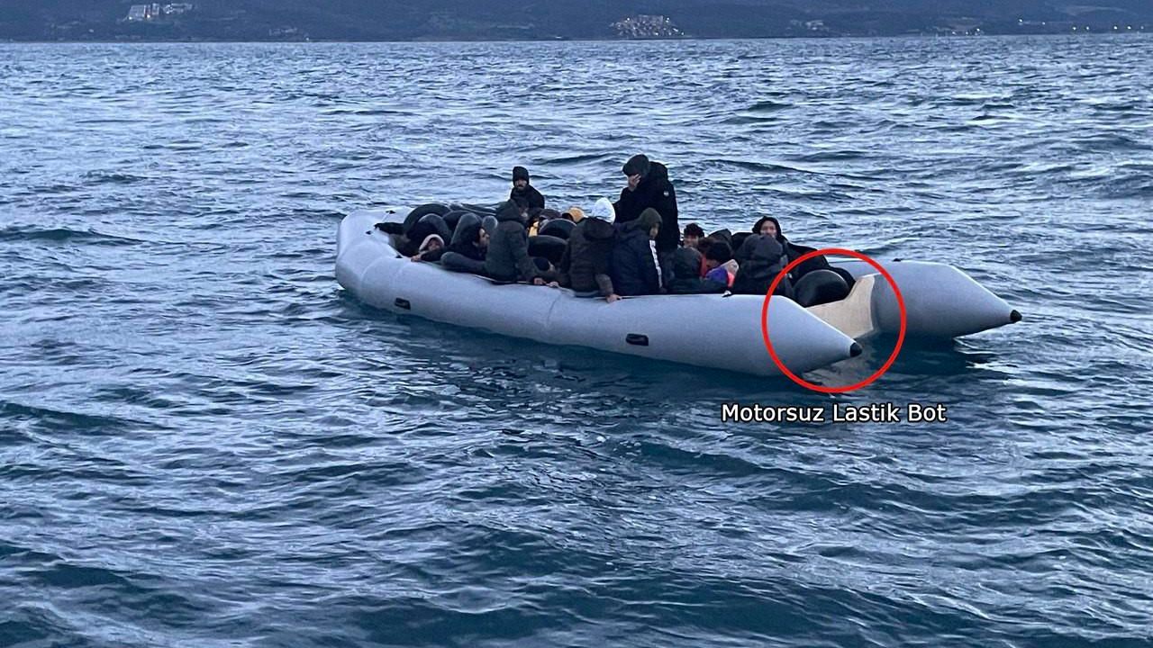 Sahil Güvenlik ekiplerince paylaşılan görüntülerde, kaçak göçmenlerin lastik bottaki motorunun söküldüğü ve deniz ortasında yağmur altında mahsur kaldığı görülüyor.