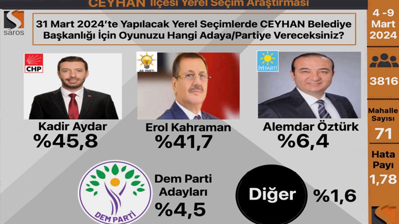 Saros Araştırma, Adana’nın Ceyhan ilçesinde 4-9 Mart tarihleri arasında; ilçedeki 71 mahallede toplam 3 bin 816 kişiyle yüz yüze görüşme gerçekleştirdi. Ankete katılanlara; “31 Mart’ta yapılacak olan yerel seçimlerde Ceyhan Belediye Başkanlığı için oyunuzu hangi adaya/partiye vereceksiniz?’ diye soruldu.