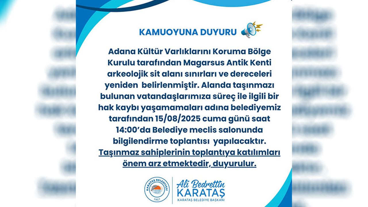 Yapılan duyuruda, Adana Kültür Varlıklarını Koruma Bölge Kurulu tarafından Magarsus Antik Kenti arkeolojik sit alanı sınırları ve derecelerinin yeniden belirlendiği bildirildi.