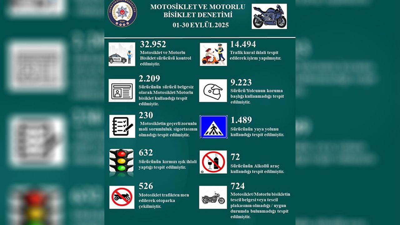 Adana İl Emniyet Müdürlüğü Trafik Denetleme Şube Müdürlüğü ekipleri, 1–30 Eylül 2025 tarihleri arasında motosiklet ve motorlu bisiklet sürücülerine yönelik yoğun denetimler gerçekleştirdi.