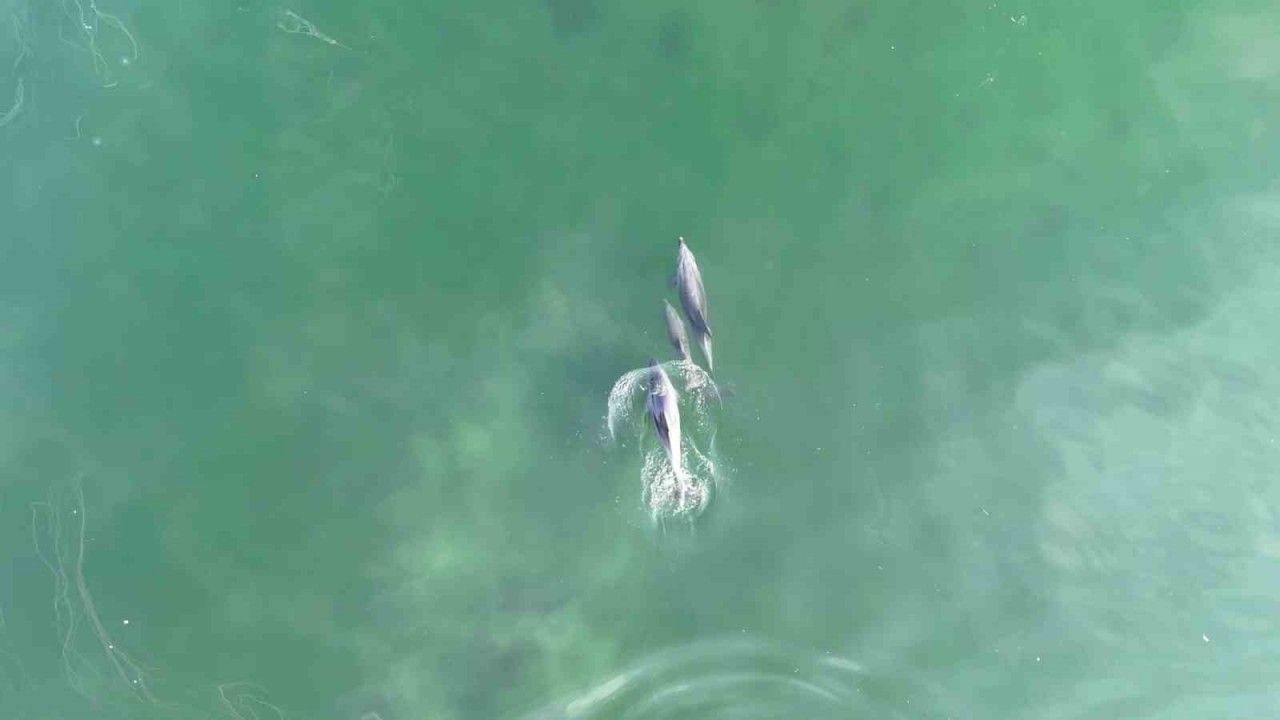 Biri yavru olan bu sevimli deniz canlıları, masmavi sularda adeta dans edercesine sıçrayıp dalgalarla yarıştı. Yan yana süzülüp aniden derinlere dalan yunuslar, Körfez’in sakin sularında ritim tutar gibiydi. Bu büyüleyici anlar, havadan dron ile kaydedilerek doğanın en huzurlu karelerinden biri olarak belgelendi.