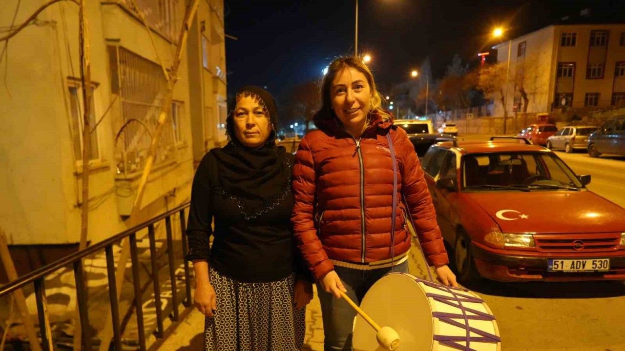 Niğde’nin kovboy muhtarı Tuğba Somkaya, davul çalanın kendisi olduğunu fark edince balkondan seslenenler ve onu görüp sokağa inenlerle de sohbet ederek Ramazan aylarını tebrik ediyor.